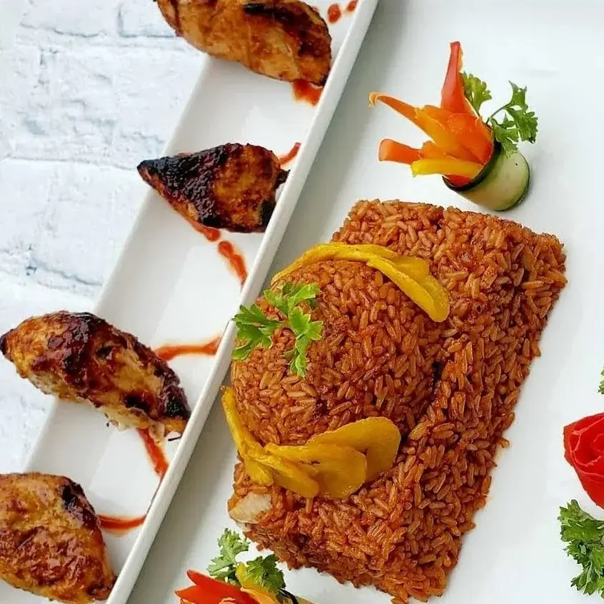 Premium jollof rice cooked in rich spices, served with grilled chicken or beef.